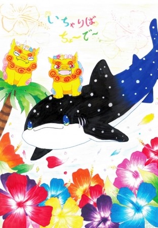 ハイビスカスの色付と花びらの動きを表現するのと、ジンベイザメとシーサーが一緒に泳いでいるように描きました。