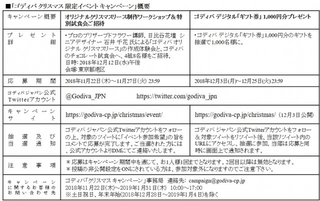 「ゴディバ クリスマス限定イベント キャンペーン」は、Twitterでゴディバ ジャパン公式アカウントをフォローし、キャンペーン対象のツイートに『イベント参加希望』とコメントしていただいた方のうち、抽選で4組8名様を、ブリザーブドフラワー講師、石井 千花氏による『ゴディバ オリジナルクリスマスリース』の制作ワークショップとチョコレートの特別試食会にご招待するキャンペーンです。
