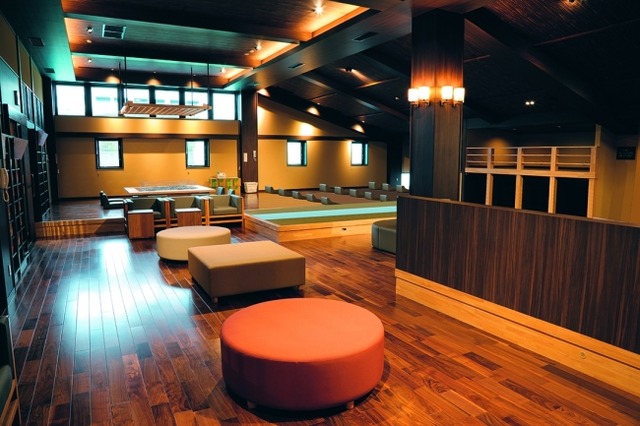 「温暖ルーム」は常温+2~3℃に空調管理し、湯上がりの体を温めます。囲炉裏のある琉球畳スペース、個を満喫できる巣篭もりスペース、ごろ寝エリアがあり、思い思いのスタイルでお過ごしいただけます。また、温暖ルームの隣にあるカフェコーナーには個別にテレビを楽しめるリクライナーコーナーがあり、約10,000冊のマンガ本も楽しんでいただけます。