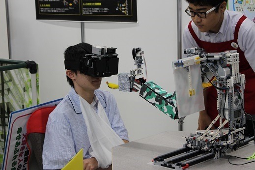 このうち中学チームが開発したのは、ARを活用した食事介助ロボットです。食べ物を口に運ぶ手のパーツとARゴーグルで構成しオリジナルアプリで制御します。ARゴーグルをかけてロボットを見ると画面には、「お母さん」が現われ、あたかも「お母さん」から食事の介助をうけているような体験をすることができます。仮想とはいえ気持ちの上で充実した食事体験を提供することで、心から健康になってもらいたいという女子生徒の思いから生まれました。