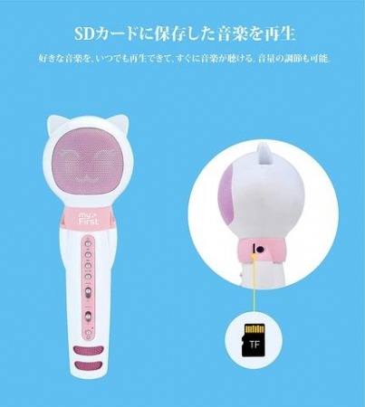 myFirsrtVoiceは子供用のスピーカー内臓のマイク型おもちゃ!スピーカーで音楽を流しながら、エコー機能付きのマイクで歌う事ができます。