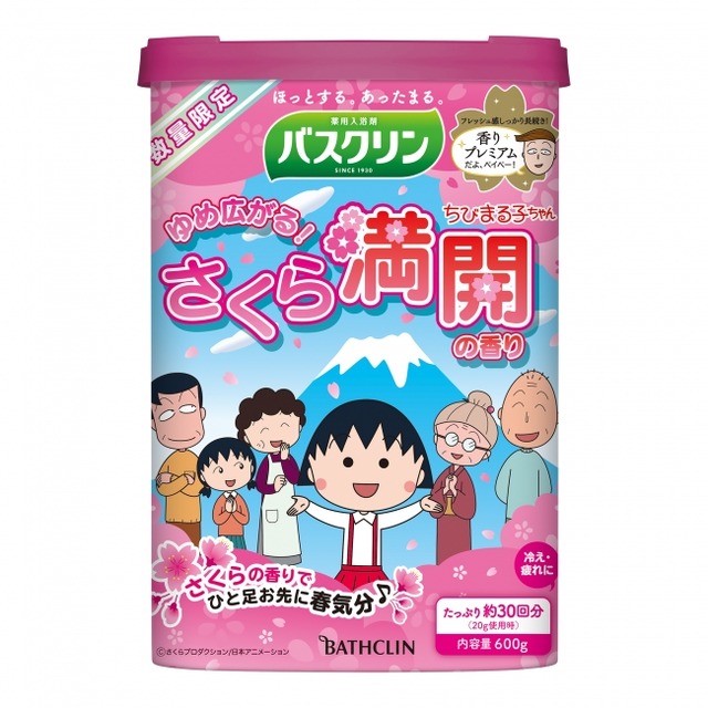 今年も、「ちびまる子ちゃん」をパッケージデザインに取り入れた「バスクリン ちびまる子ちゃん ゆめ広がる! さくら満開の香り」でそれぞれの「祝い・門出」を応援すべく、12月3日(月曜日)に数量限定の企画品として発売します。