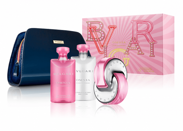 「ローズ ゴルデア」と並び、ブルガリ フレグランスで人気の2つの香り「オムニア クリスタリン」と「オムニア ピンク サファイヤ」のホリデーコフレも注目を集めています。フューシャピンクがアクセントになったネイビーブルーのパテント調のポーチにフレグランス現品と同じ香りのボディケアアイテムがセットされています。