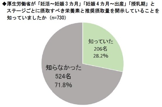 厚生労働省は、「妊活~妊娠3カ月」「妊娠4カ月~出産」「授乳期」という3つのステージごとに、摂取すべき栄養素と推奨摂取量が異なることを発表しています。しかし、その旨を知っていましたかという質問に対し、7割以上の方が「知らなかった」と回答しています。