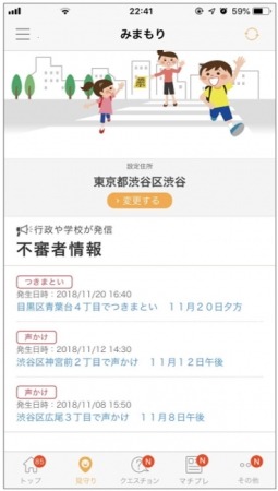 日本不審者情報センター( https://fushinsha-joho.co.jp/doc.cgi?file=company )は、全国の警察や自治体が公表する不審者情報を独自に編集・配信し、データベース化している、不審者情報専門の機関です。今回、「マチコミ」アプリ内で「日本不審者情報センター」から配信される不審者情報を元に、不審者情報の提供を開始しました。利用者が設定したエリアの不審者情報が新しく開設された「見守り」ページでご覧いただけるようになりました。
