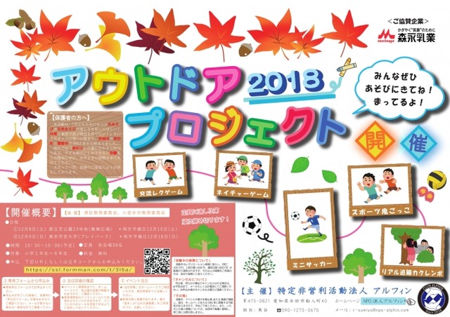 愛知県を中心に子どもの野外活動を支援する特定非営利活動法人アルフィン(所在地:愛知県半田市)は、森永乳業株式会社(本社:東京都港区)・東京学芸大学のご協賛ご協力により、東京都港区、小金井市にて自然あそびイベント『アウトドアプロジェクト』を初開催します。