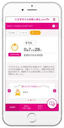 倉吉市に採用された『くらすけくんのあしあと』は、スマートフォン・タブレット端末・PCに対応したサービスで、妊産婦と子どもの健康データの記録・管理や予防接種のスケジュール管理、出産・育児に関するアドバイスの提供など、育児や仕事に忙しい母親や父親を助けてくれる便利な機能が充実しています。
