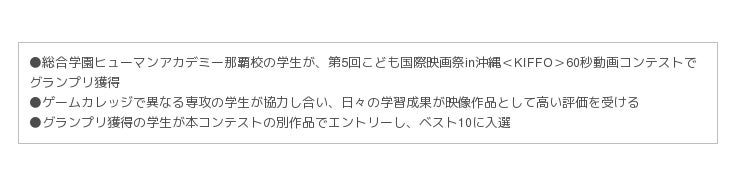 2018年11月17日(土)と18日(日)に沖縄県で開催された「第5回こども国際映画祭in沖縄<KIFFO>」の前夜祭イベント「KIFFO×吉本興業60秒動画コンテスト」に、総合学園ヒューマンアカデミー那覇校の学生5名が制作した作品が、見事グランプリを獲得しました。
