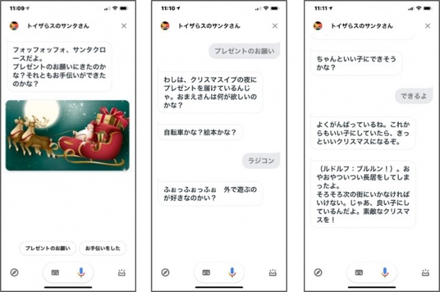 お子様の「本当に欲しいクリスマスプレゼントはサンタクロースにだけ教える」という、微笑ましいけど親としては聞き出し方に頭を悩まされる状況に「トイザらスのサンタさん」は大活躍します。操作は簡単です。“Google アシスタント”を起動し『トイザらスのサンタさんとお話ししたい』と話しかけてください。サンタクロースが登場し、お子様の欲しいプレゼントを聞いてくれます。また、プレゼントを聞いた後もサンタクロースとの会話は続き、日ごろのお手伝いを褒めるなど、お子様の健やかな成長も応援します。会話にはパターンが複数ありますので、お子様が何度アクセスしてもサンタクロースとの会話をお楽しみいただけます。