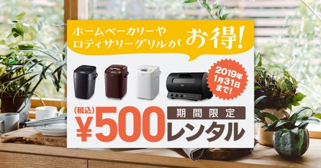 キャンペーン期間中、対象のパナソニック製品のホームベーカリー3種とロティサリーグリル1種が指定のクーポンをご利用いただくことで500円/7日間でレンタルすることができます。