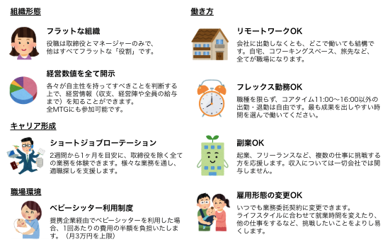当社は、「労働革命で、人をもっと自由に」をビジョンに掲げ、2014年の創業時から「リモートワーク」という新しい働き方を全社的に取り入れております。現在では500名以上の従業員が自由な働き方を実現しており、日本が抱える圧倒的な労働者不足の解決やリモートワーカー及びこれから新しく働き方を変えようとチャレンジする方々のために様々なサービスを行っております。