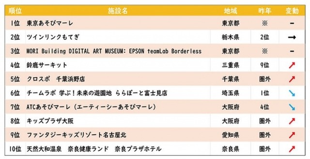 また、クライミングやトランポリンなどが屋内で楽しめる「クロスポ 千葉浜野店」、巨大ブロックやふわふわ遊具などで遊べる「ATCあそびマーレ」などもTOP10入り。天候に左右されない屋内スポットが8施設もランクインし、昨年に引き続き、屋内施設の人気の高さを証明する結果となりました。