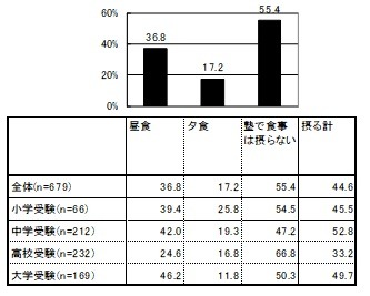 2. 平日で3割、休日で4割の受験生が塾で食事を摂っており(結果2)、3割はコンビニ等で買った食事
