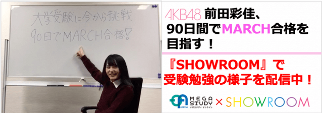 2018年12月5日、このプロジェクトに参加する人気アイドルグループAKB48前田彩佳が、2019年の大学入試挑戦を表明しました。明治大学(M)、青山学院大学(A)、立教大学(R)、中央大学(C)、法政大学(H)、以下、MARCHへの合格を宣言。『メガスタディ・オンライン』のプロ家庭教師陣が試験までの約90日間で合格に導きます。さらに、受験勉強に奮闘するアイドルの様子を日本で初めて「SHOWROOM」にて配信いたします。