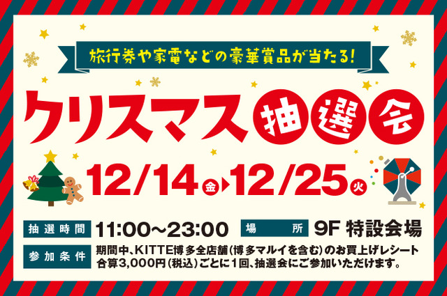 日本郵便株式会社(東京都千代田区、代表取締役社長 横山 邦男)およびJPビルマネジメント株式会社(東京都千代田区、代表取締役社長 野村 洋)は、「KITTE博多」(福岡県福岡市博多区博多駅中央街9番1号)において、2018年12月14日(金)~12月25日(火)の期間、20万円分の旅行券や家電などの豪華賞品が当たる「クリスマス抽選会」を開催します。