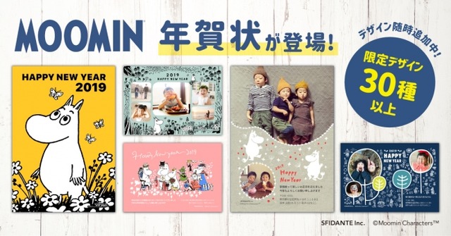 世代を超えて愛され続ける、フィンランド生まれの「ムーミン」とコラボして、「スマホで写真年賀状」オリジナルの年賀状デザインを30種以上ご用意しました。