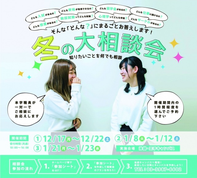 東京福祉大学では、一般入試の出願期間に合わせ、『冬の大相談会』を池袋・王子の両キャンパスで実施いたします。入試や大学の内容等について個別に相談できるほか、事前に登録すれば校舎見学や授業見学(授業実施日のみ)も可能。東京福祉大学について詳しく話を聞くことができる機会ですので、これから一般入試での受験を考えている方や冬休みの宿題などで学校訪問をしたいと考えている2年生・1年生の方など、東京福祉大学に興味をお持ちの方はぜひこちらにご参加ください。