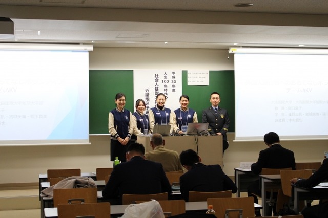 社会人基礎力とは「職場や地域社会で多様な人々と仕事をしていくために必要な基礎的な力」と経済産業省が提唱しているもので、「社会人基礎力育成グランプリ」では大学のゼミ・研究・授業等を通じて、どれだけ社会人基礎力が伸びたかをチームで発表します。大阪国際大学・大阪国際大学短期大学部からは「JR関西空港駅 外国人旅行者へのおもてなしボランティア -チームAKV-」として教員1名、学生3名、JR社員1名が出場し、具体的な事例を挙げながら、活動を通じて身につけた社会人基礎力について発表しました。