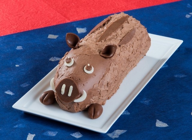 干支をモチーフにシェフパティシエの遊び心を生かしたロールケーキを2010年から販売しています。2019年は干支「亥」にちなみ、いのししのロールケーキをご用意します。チョコレートの生地に苺のクリームを巻き込んだロールケーキの周囲には、チョコレートクリームで毛並みを表現しました。目や鼻などもチョコレート製で、思わず笑みのこぼれる愛嬌のある顔つきです。