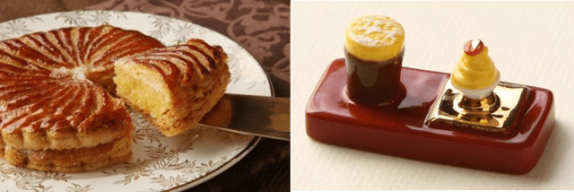 アーモンドの優しい甘さとコクを感じられる生地「クレームダマンド」を、サクサクのパイ生地で包み焼きあげたフランスの伝統的な新年のお菓子です。中には「フェーヴ」とよばれる陶器製のチャームがひとつ入っており、切り分けてそれが当たった人は、その一年幸運に恵まれると言われています。