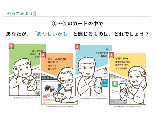 カスペルスキーと静岡大学 教育学部 塩田研究室では、シニアのインターネットリテラシーを高め、安心してインターネットを利用するための判断力を身に付けていただくために、カード形式の情報セキュリティ啓発教材「ネットの『あやしい』を見きわめよう」のシニア編を共同開発しました。