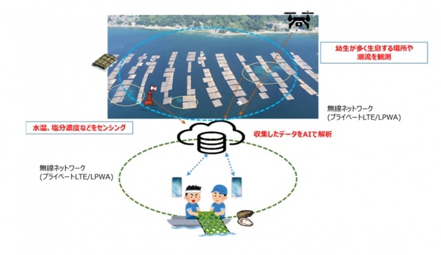 実証実験は、広島県江田島市のかき養殖場に専用の次世代通信インフラ(プライベートLTE(※2)/LPWA(※3))を構築して実施します。漁場のブイや養殖用の筏(いかだ)にセンサーを設置し、海水の温度や塩分濃度などを遠隔監視するとともに、ドローンに搭載したカメラで上空からかきの幼生が多く生息する場所や潮流などを観測します。これらのデータをクラウド上に収集・蓄積し、AIが分析・予測を行い、採苗(※4)に適した場所や時期を養殖業者のスマートフォンにお知らせします。また、水中監視センサーにより食害の原因となる魚が筏に近づいた際も検知して通知します。これらのAI/IoTの活用により、離れた場所からかきの生育環境をリアルタイムに把握し、早期に対応することが可能となります。採苗不調や育成不良を抑制し、かき養殖生産の効率化や業務効率の改善、労働負担の軽減が期待できます。さらに、かきの養殖におけるノウハウを可視化することで、漁業の後継者育成にも貢献します。