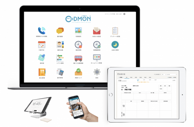 コドモンは、園長や保育士、事務員の日々の業務負担軽減を目的とした業務支援システムです。ICT化によって指導案や日誌の作成、園児毎の登降園管理や保育料計算、請求管理、さらには保護者連絡まで一貫してサポートしています。