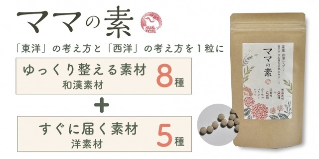 ゆっくりと心と体に届く和漢素材8種類と比較的早期に体感を得られるとされる洋素材5種の作用メカニズムを十分に研究した上で組み合わせたところに最大のオリジナリティがあります。また、授乳中でも安心な素材のみを配合しておりますので、「授乳は続けたい」というママにもお飲みいただけます。