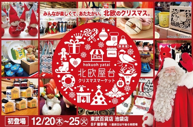 北欧屋台のクリスマスバージョン「北欧屋台 クリスマスマーケット」初開催の東武百貨店 池袋店では、30店以上の北欧雑貨店やブランド、北欧フードやカフェが登場します。人気ブランドの北欧雑貨をはじめ、ムーミン、リサ・ラーソンなどの北欧キャラクターグッズが大集合。北欧のヴィンテージ陶器やアクセサリー、北欧ならではの輸入食品など、最大級のラインナップでお迎えします。