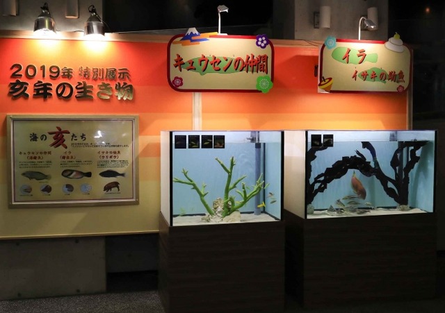 展示生物は来年の干支・猪(イノシシ)にちなんだ名前が付いた海の生き物で、中国名に「猪」が付く「イラ(猪歯魚)」と「キュウセン(海猪魚)」と、体の模様がイノシシの子どもに似ていることから「ウリボウ」と呼ばれることのある「イサキの幼魚」の計6種61点です。