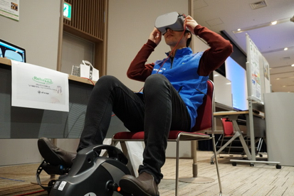 また、医療保健学部 医療情報学科の今泉一哉教授とsilvereye株式会社が共同で開発している、VR映像を使ったリハビリテーション支援サービス「RehaVR」の体験コーナーも出展いたしました。 「RehaVR」は、隅田川やスカイツリーの映像を体験できる「東京」をはじめとした5つのコースから好きな場所を選ぶことが出来ます。本学の卒業生も参加し、多くの来場者に体験いただきました。