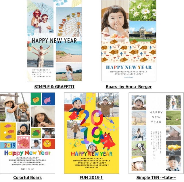 例年通り、干支や写真が沢山入れられるデザインに加え、今年は平成最後のお正月ということもあり、明るく新年を迎えてもらいたいという思いからか、明るい配色のデザインが人気です。