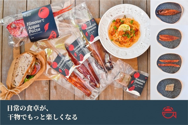 アタラシイヒモノは、塩や砂糖、ハーブなどを合わせたソミュール液や、選りすぐりのハーブ&スパイスで調味することで、干物としての味わいをさらに凝縮しました。焼いて食べるだけでなく、アクアパッツァやスープなど、洋風料理の素材としてもおすすめ。調理は魚グリル不使用。フライパンやオーブンを使うので、キッチンが汚れません。これまでの干物は魚グリルで焼くことが中心の「ご飯のお供」、すなわちサイドディッシュでした。しかし、アタラシイヒモノではプロ仕様の「メインディッシュ」が誰でも15分でつくることが可能です。スローガンは「サイドディッシュからメインディッシュへ」。