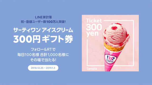 登録ユーザー数100万人突破を記念して、12月25日(火)より毎日100名、合計1,000名に「サーティワン アイスクリーム 300円ギフト券」がその場で当たるTwitterキャンペーンを実施いたします。