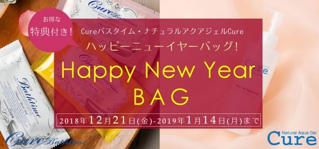 株式会社Cure(本社:東京都千代田区 代表取締役:洲崎智広)は、12月21日(金)から1月14日(月)まで、公式通販サイトにて、バスタイムの分包52個をセットにした「Happy New Year BAG バスタイムセット」とナチュラルアクアジェル250g4本をセットにした「Happy New Year BAG ナチュラルアクアジェルセット」を販売いたします。