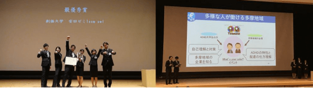 Team owlは「多摩に住む発達障害者が活き活きと働けるまちづくり~自覚していない発達障害者が一般雇用で定着できる~」と題して発表しました。当事者が就労後にさまざまな悩みに直面している点に着目。調査を進める中で、就労前に自身の特性の得手不得手を理解し、その対策法を知り、身につける重要性を提案しました。