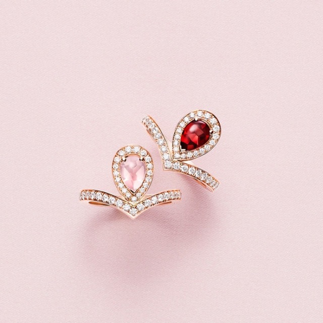 そして、ピンクサファイアまたはアクアマリンがセットされた2つのパヴェリングはこのカラフルなコレクションを完成させます。自由にミックスし、遊び心あふれる組み合わせで自分らしさを表現することができるコレクションです。