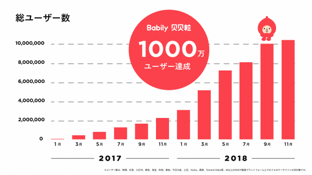 ワンドット株式会社(本社:東京都港区、代表取締役CEO:鳥巣知得)は、中国にて展開する(※1)育児動画メディア「Babily(ベイビリー、中国名”贝贝粒”)」のユーザー数(※2)が2018年11月末時点で1,000万人を突破いたしましたので、お知らせいたします。