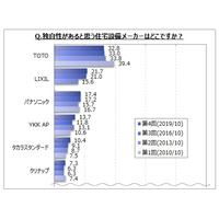 【住宅設備メーカーのイメージに関するアンケート調査】『信頼性』などいずれのイメージも「TOTO」がトップ。『独自性』『先進的』イメージで、「LIXIL」「タカラスタンダード」は他のイメージより上位に