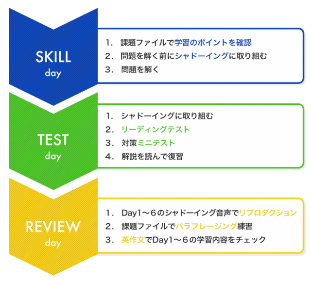 TOEIC(R)攻略に必要な単語・文法知識・解法テクニックを4週間(28日分)の課題で完全網羅します。「声に出して真似る」トレーニング、シャドーイングも行うことで総合的な英語力向上を目指します。