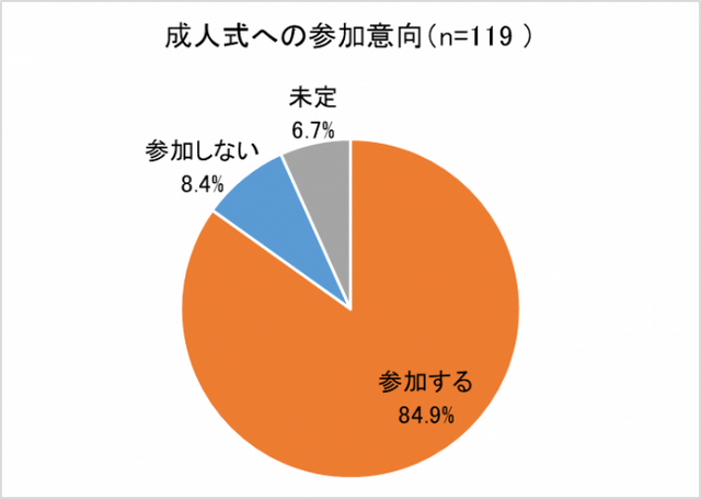 成人を迎える学生にアンケート調査を行ったところ、119名のうち8割以上が「成人式」に参加する意向であることがわかりました。