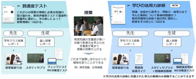 『スタディサプリ』では、授業の前に生徒の学力を『到達度テスト』で把握し、授業理解の前提知識の学び直しによって授業理解度の向上を支援しています。また、授業理解度が上がることで、より重要となる「主体的・対話的で深い学び」への移行も促進します。さらに『学びの活用力診断』で、基礎学力から思考力・判断力・表現力までを総合的に測定し、事後教材で補強することで、学力向上につながるPDCAサイクルの実現を促進します。