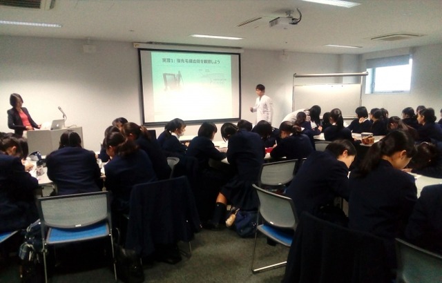 当日は、江戸川女子中学校・高等学校の生徒、約50名が東京大学生産技術研究所の教室に集まる中、次世代育成オフィス(ONG) 川越至桜准教授のご挨拶で始まり、続いて、統合バイオメディカルシステム国際研究センター松永行子准教授の「毛細血管の仕組みとはたらき」をテーマとする授業が行われました。