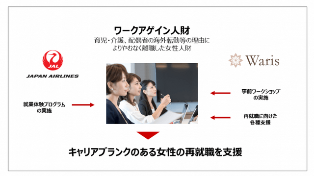 日本航空株式会社(本社:東京都品川区、代表取締役社長:赤坂祐二、以下「JAL」)、株式会社Waris(所在地:東京都港区、代表取締役:米倉史夏・田中美和・河京子、以下「Waris」)(*1)は、出産や配偶者の転勤などでキャリアにブランクのある女性(=ワークアゲイン人財)の再就職を支援するプログラム、JAL×Waris「ワークアゲインプログラム」を開催します。