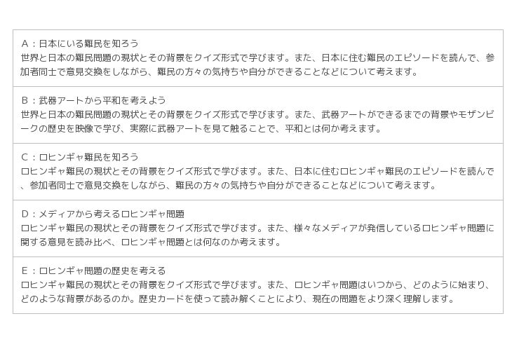 ワークショップは無料で、事前予約制で、グループであればどなたでもお申込いただけます。「難民・避難民」をテーマにした展示およびワークショップは2019年3月までとなります。この機会にぜひ、3月までにご利用ください。