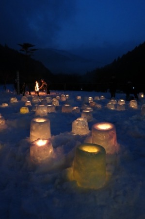 澄み切った夜空に広がる星空の下でスノーキャンドルが醸し出す幻想的な空間