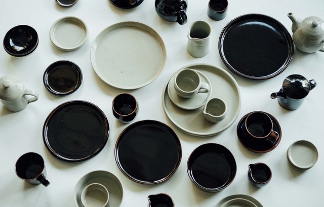 「BOTE&SUTTO」はその名前の通り、ぼてっと丸みを帯びた形と、すっとラインの通った形の2タイプを展開します。益子で使われている主な7色の釉薬のうち、一番益子の定番と感じる黒と並白の2色を用いること、益子の土を使うこと、型を使わないこと、器の幅、といったガイドラインを設定し、それに沿って、3つの窯元が腕を振います。すべて手で作られた、味わい深く食卓の定番となる器は、ますます多様化する食卓にも対応できる器シリーズです。
