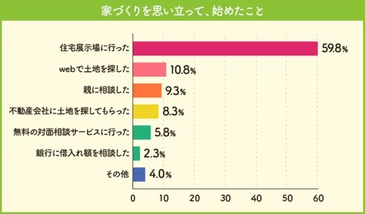 3年以内に注文住宅を購入した人への調査結果を見ると、家づくりを思い立って始めたのは「住宅展示場に行った」が約6割とトップ。本調査では「土地がない人」が66.3%いたため、展示場訪問と同時にWebで探したり、不動産会社への土地探しを依頼したりする人が1割前後みられた。