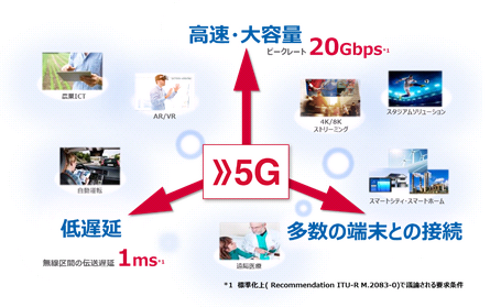 「高速・大容量」「低遅延」「多数同時接続」の3つを特徴とした、第5世代の通信規格[画像2: https://prtimes.jp/i/33889/13/resize/d33889-13-336764-1.png ]