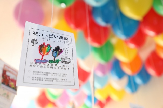 花いっぱい運動とは街を花いっぱいにして景観づくりと、犯罪のない住みよい地域にしていこうという願いを込めて、子どもたちと地域の警察の方と協力して風船に花の種とメッセージカードをつけ飛す行事です。
